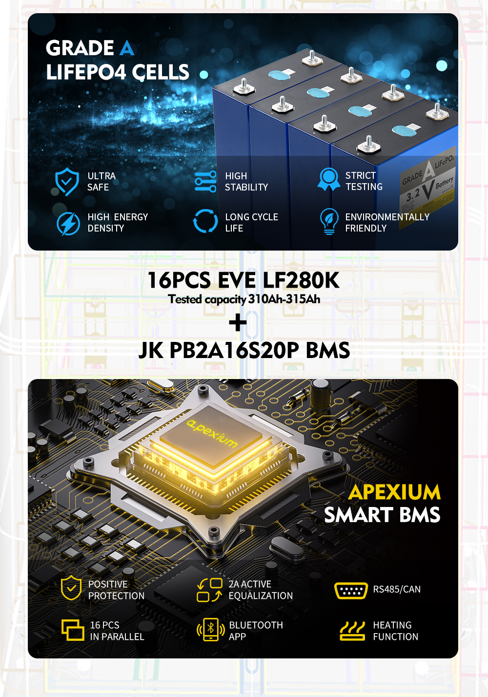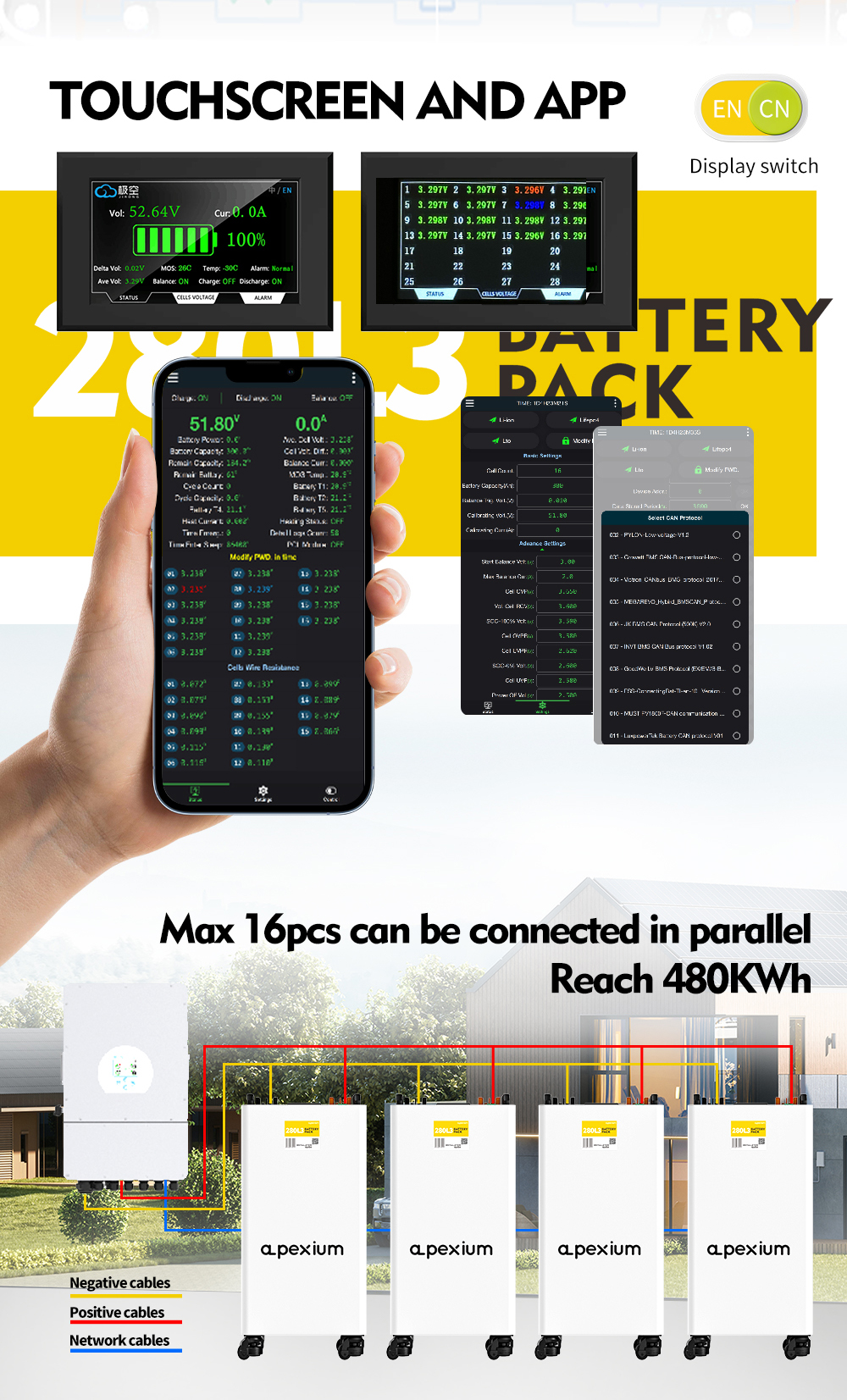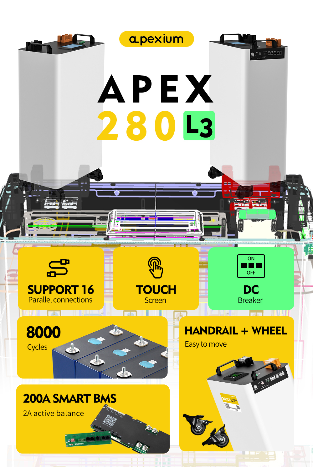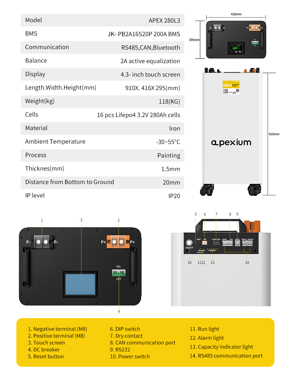 USA stocks Apexium L3 51.2V 280Ah 14.3KWh moveable Battery pack with JK PB2A16S20P V19 BMS